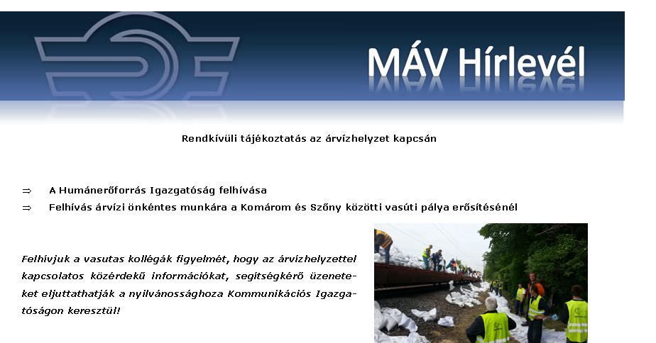 Hírek Árvízhelyzet: A MÁV tájékoztatója 2013.06.07 A vállalat a Komárom és Szőny közti vonalszakasz árvízvédelmi megerősítéséhez vasutas önkénteseket keres! Mellékeljük a MÁV közleményét: Letölthető dokumentumok: 44526-2013-MAV.pdf Megosztom Facebookon Link másolása