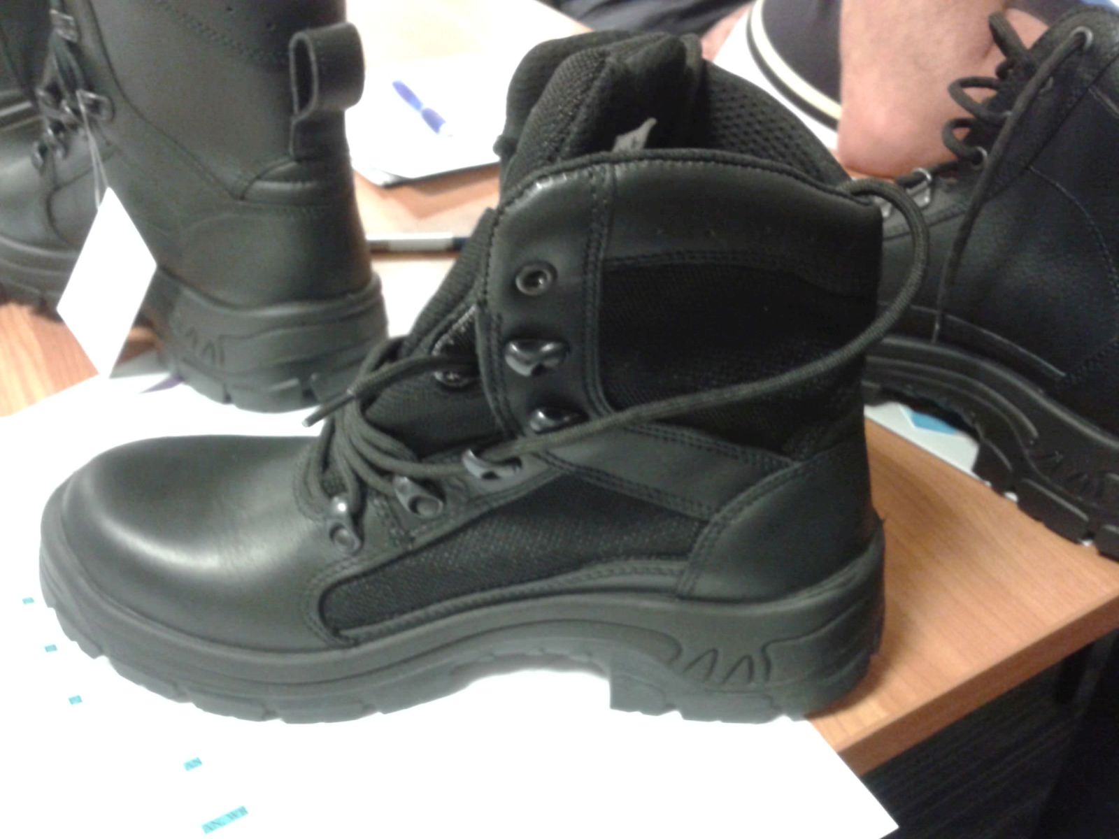 A megbeszélésen a gyár képviselői bemutattak két cipőmodellt is, amelyet a Honvédség és a Rendőrség számára fejlesztettek ki - ezek a kollégák körében osztatlan sikert arattak. Mint a mellékelt fényképeken is látható, egy bokacipőről van szó, ami teljes mértékben megfelel az elegyrendezők számára, létezik téli és nyári változata is. A talpa egybeöntött, a felső része minőségi bőrből készül, vízálló, könnyű: korszerű gyártástechnológia mellett kiváló minőségű anyagok felhasználásával gyártják, és minden szempontból nagyon megfelelne. Oroszi Rudolf szerint a bemutatott példányok az egyeztetésen résztvevők körében nagy tetszést arattak.