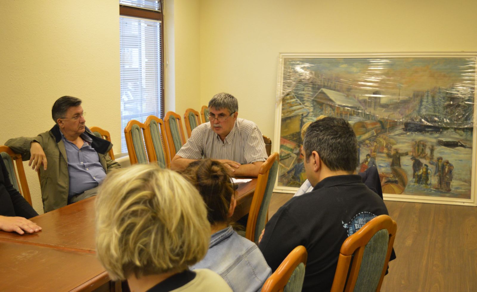 A háttérben Nagy Tibor tagtársunk alkotása a vasutas sztrájkról, ez régen még a Benczúr utcai székház tanácstermében volt, az új székházban rövidesen végre ismét méltó helyére kerül.