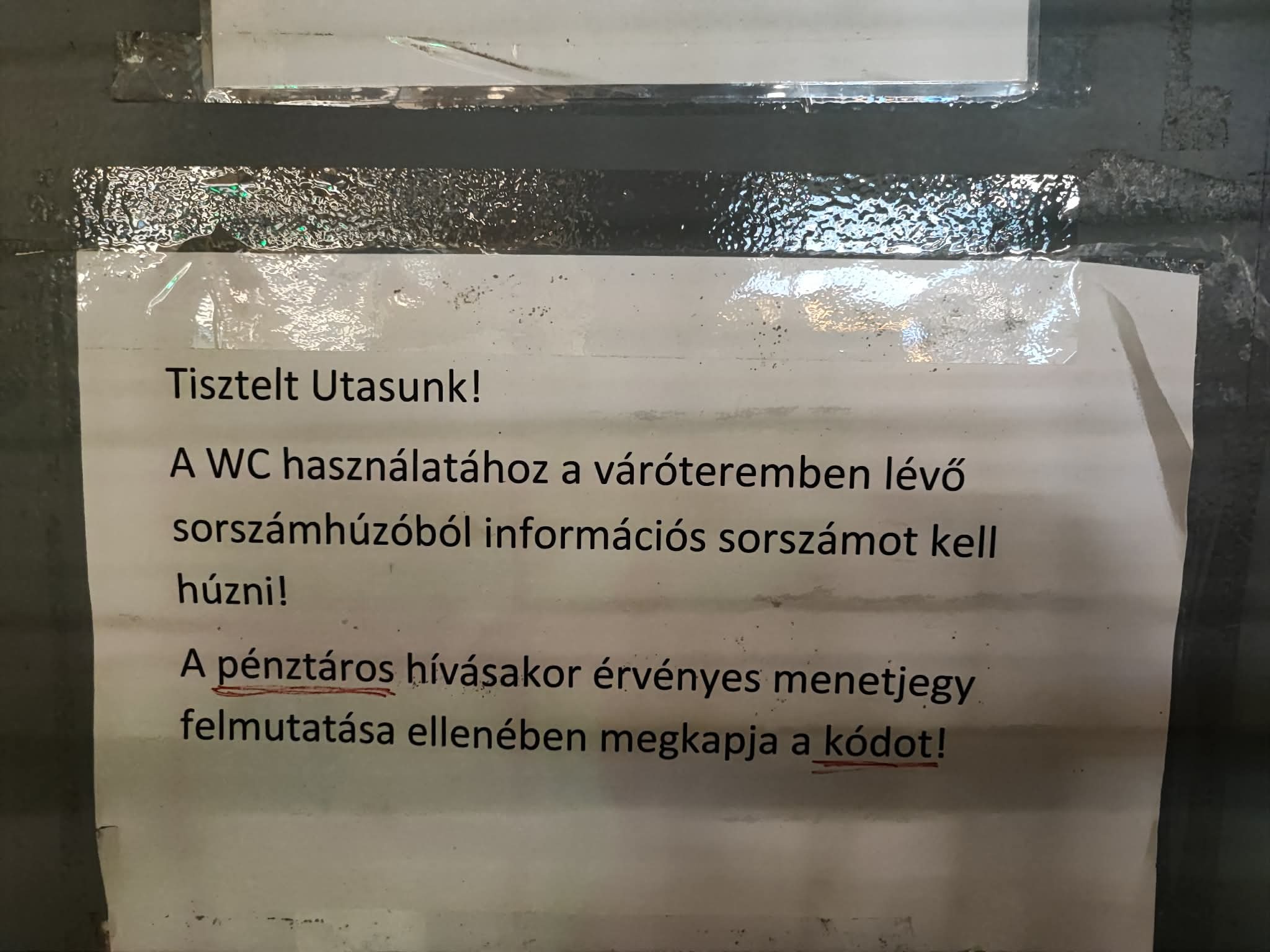 - az az általános tapasztalat, hogy sok ilyen, az állomáson rendszeresen megforduló, de ott nem utazási céllal tartózkodó személy már kifigyelte, vagy az utasoktól megszerezte a WC nyitáshoz szükséges kódot. Így a mellékhelyiséget az erre való törekvés ellenére gyakran illetéktelen, kulturálatlan viselkedésre hajlamos személyek is használják, nem ritkán súlyosan kifogásolható állapotokat hagyva maguk után;