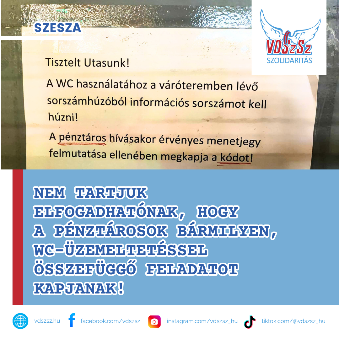 Kezdeményeztük, hogy a pénztárosokat vonják ki a WC-üzemeltetéssel kapcsolatos mindennemű feladat alól! Dr. Gönczi Tamás, a VDSzSz Szolidaritás SZESZA társasági vezetője Nagy Péterhez, a MÁV Személyszállítási Zrt. személyes és partneri értékesítési igazgatójához fordult.