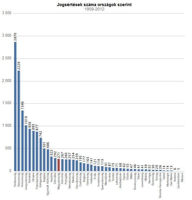 A legtöbb jogsértést Törökország, Olaszország és Oroszország követi el, de nagy különbség van az országok közt. Olaszországot például az esetek messze legnagyobb részében „csak” azért ítélik el, mert a perek túl sokáig (akár évekig is) húzódnak. A Magyarország ellen megnyert ügyek majdnem háromnegyede szintén erről szól, de Törökországot vagy Oroszországot gyakran kínzás, vagy jogellenes letartóztatás miatt ítélik el.