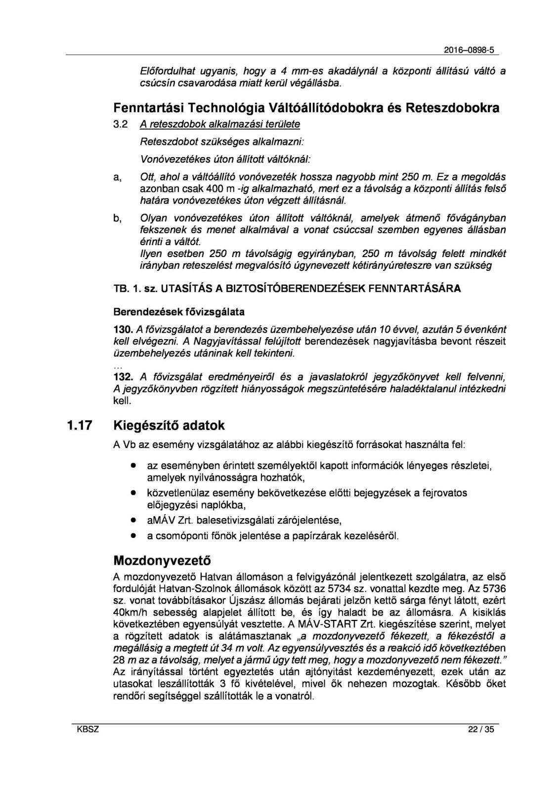 BA2016-0898-5-01: A Vb megállapította, hogy a vágányszabályozások után a váltók teljeskörű vizsgálata, mérései és azok dokumentálása nem történtek meg. A kitérőszabályozás a váltó szerkezetének és az állítóberendezés munkapontjainak elmozdulásával jár, a vonatkozó szabályok emiatt elő is írják a beavatkozás utáni mérést, azonban nincs pontosan meghatározva, hogy mit kell mérni, és hogyan kell azt dokumentálni.