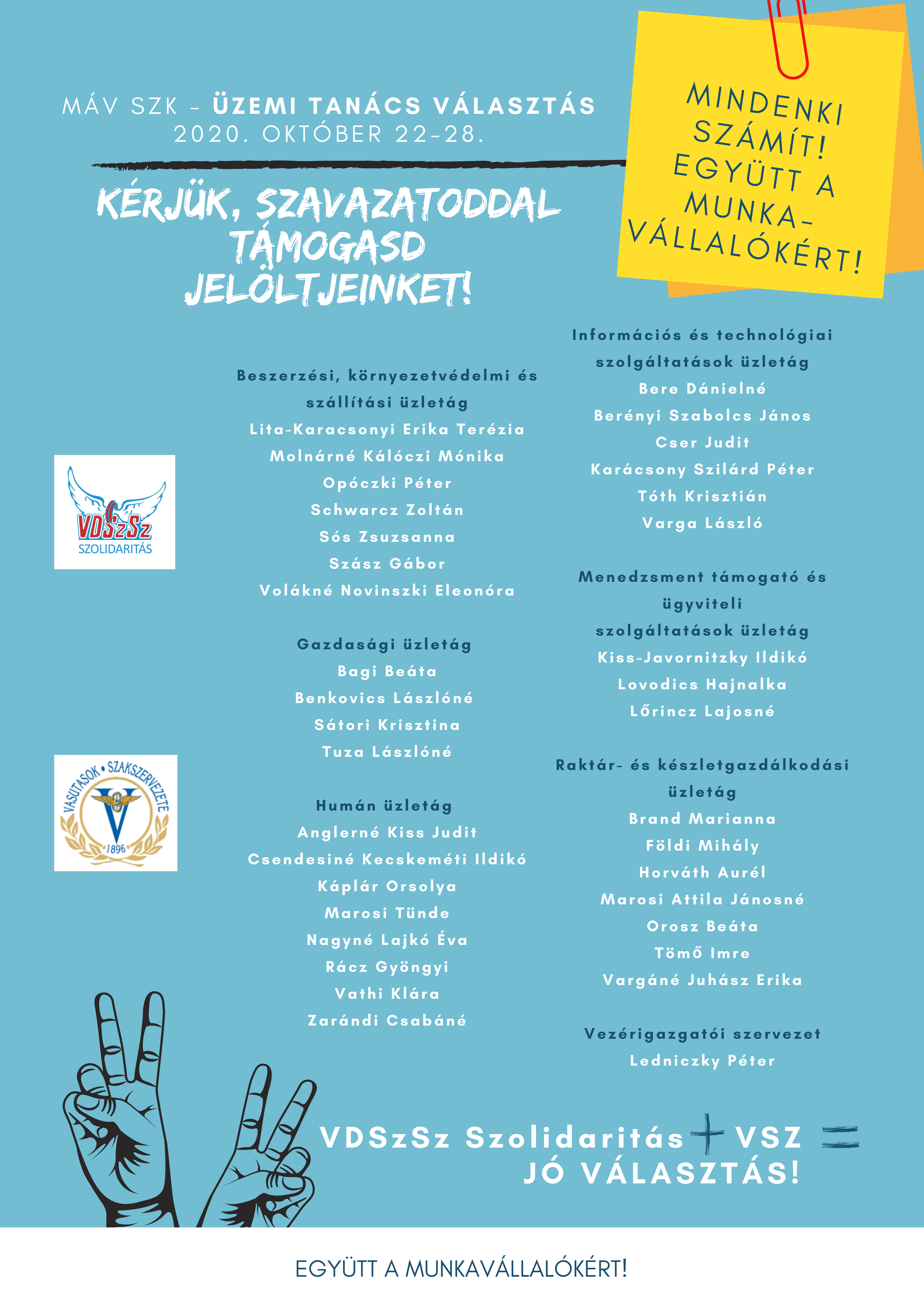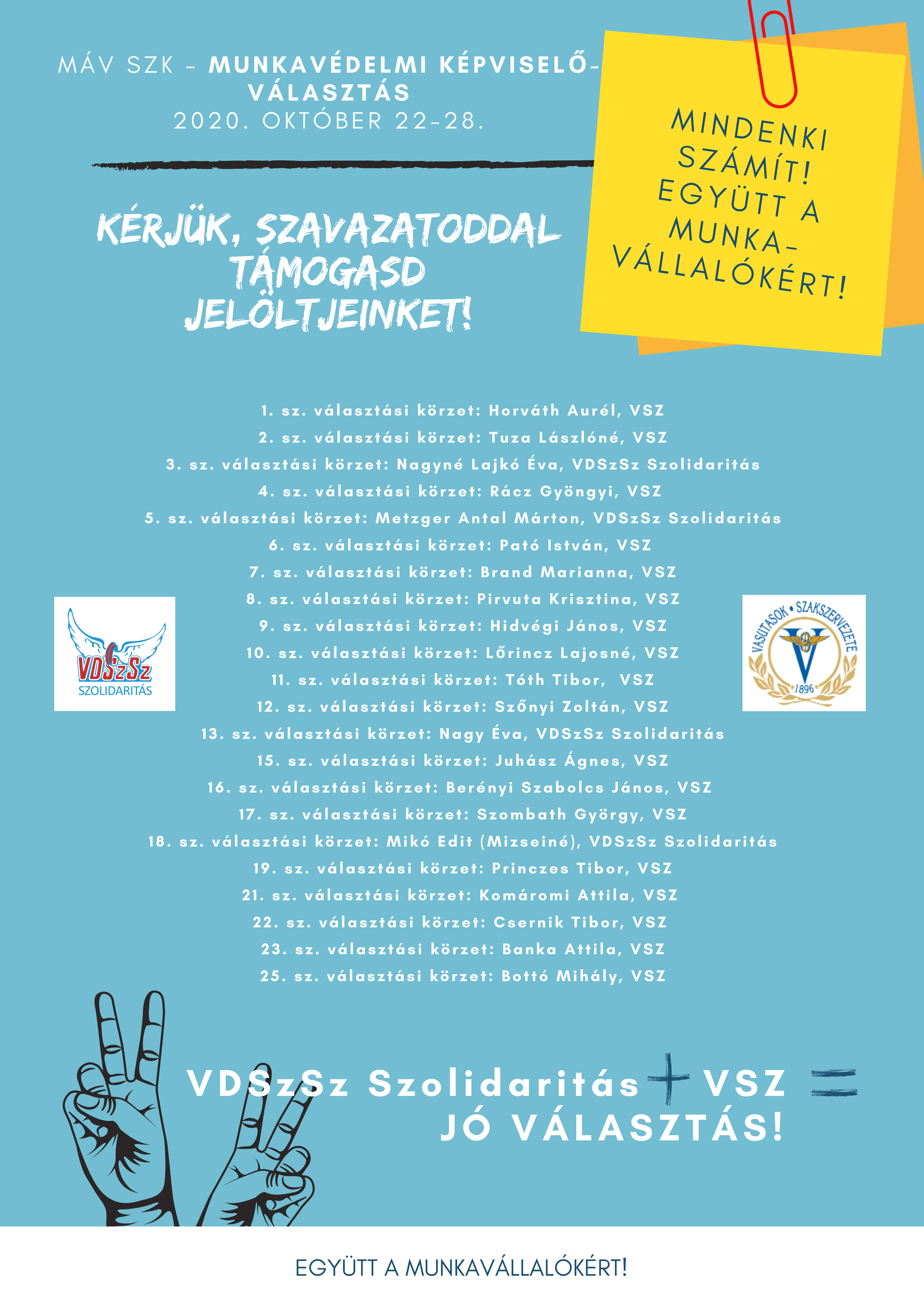 Hírek Üzemi tanács és munkavédelmi képviselő-választások a MÁV SZK-nál! 2020.10.13 Kérjük, szavazatoddal támogasd a VSZ és a VDSzSz Szolidaritás közös jelöltjeit 2020. október 22-28. között! Letölthető dokumentumok: SZK_Uzemi_Munkavedelem_a3.pdf Galéria Megosztom Facebookon Link másolása