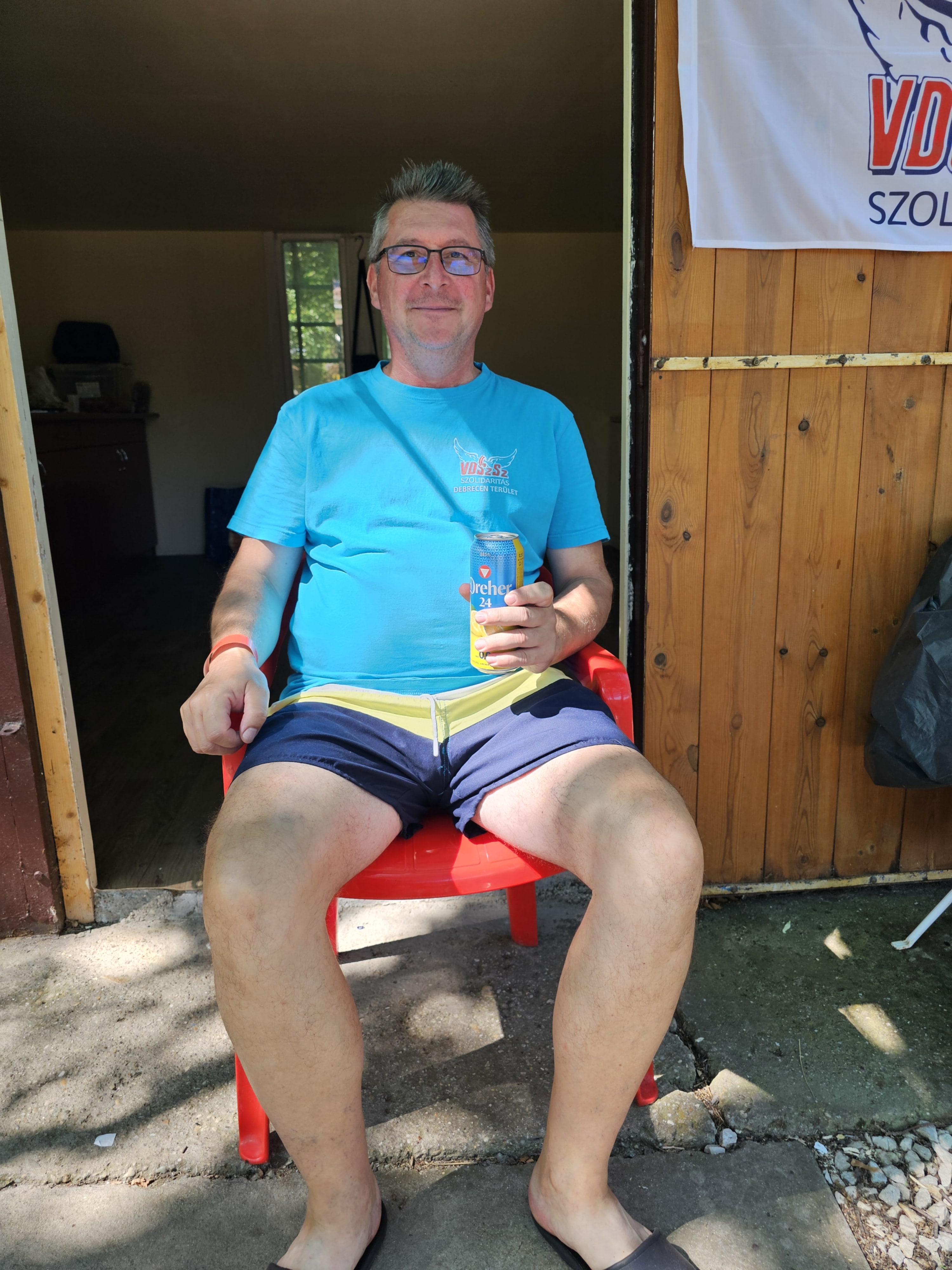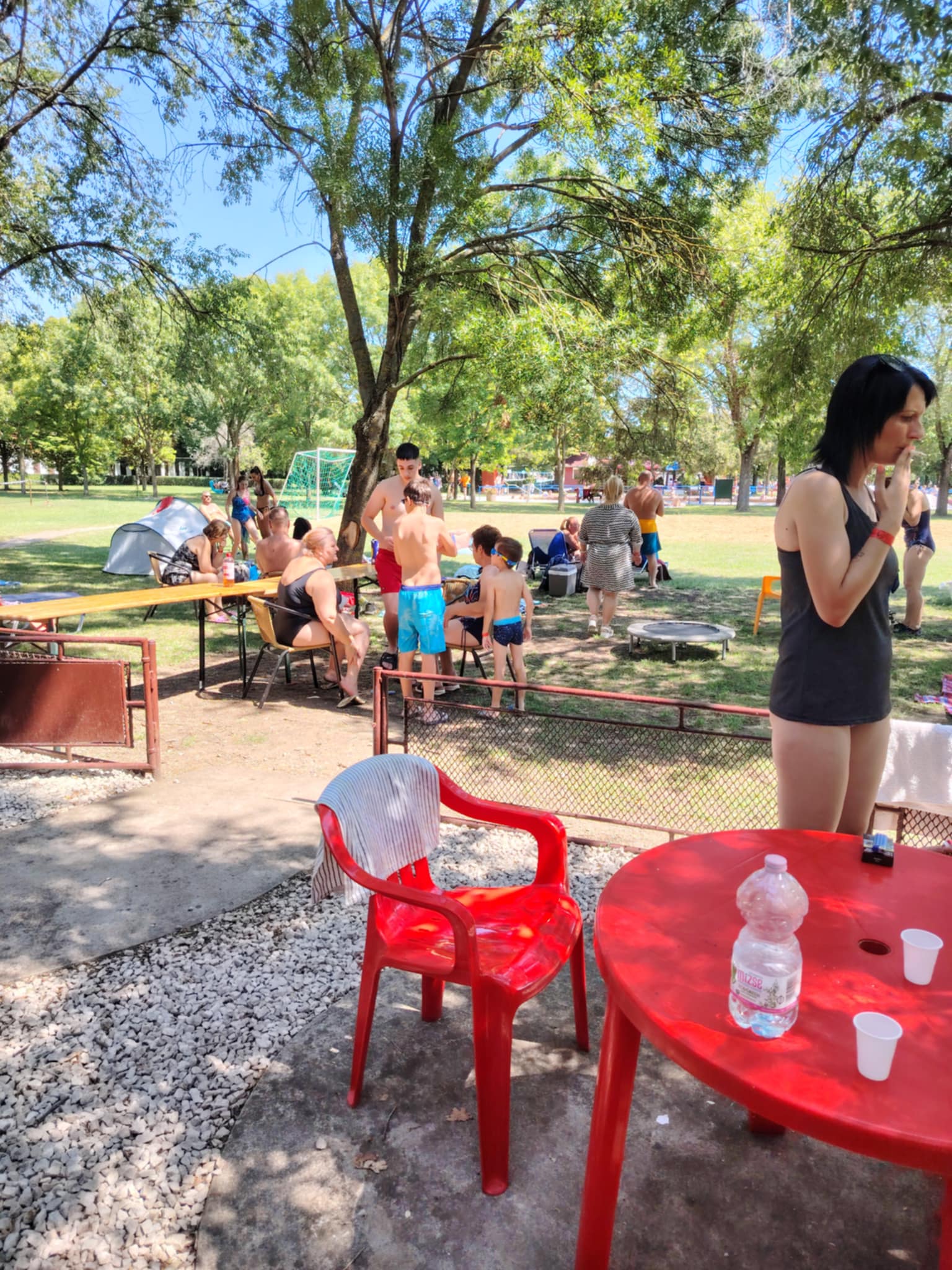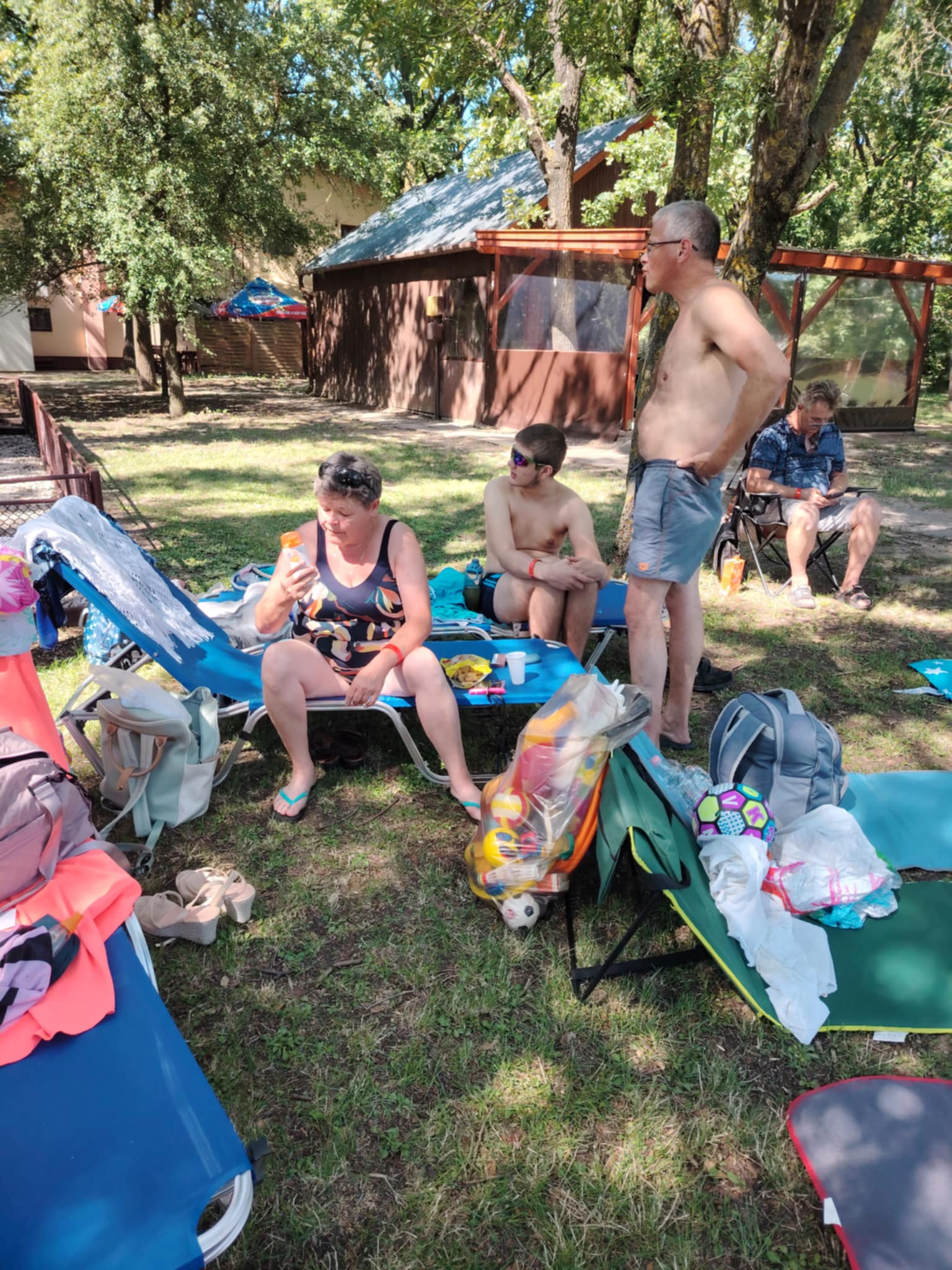 A reggeli szendvics, a kávék, a hűtött innivalók, az ebéd, a finom házi sós és édes sütemények lelőhelye is itt volt. A felnőttek, ha nem a medencékben voltak, akkor kis csoportokban beszélgettek a régen látott kollegákkal vagy napoztak, pihentek.