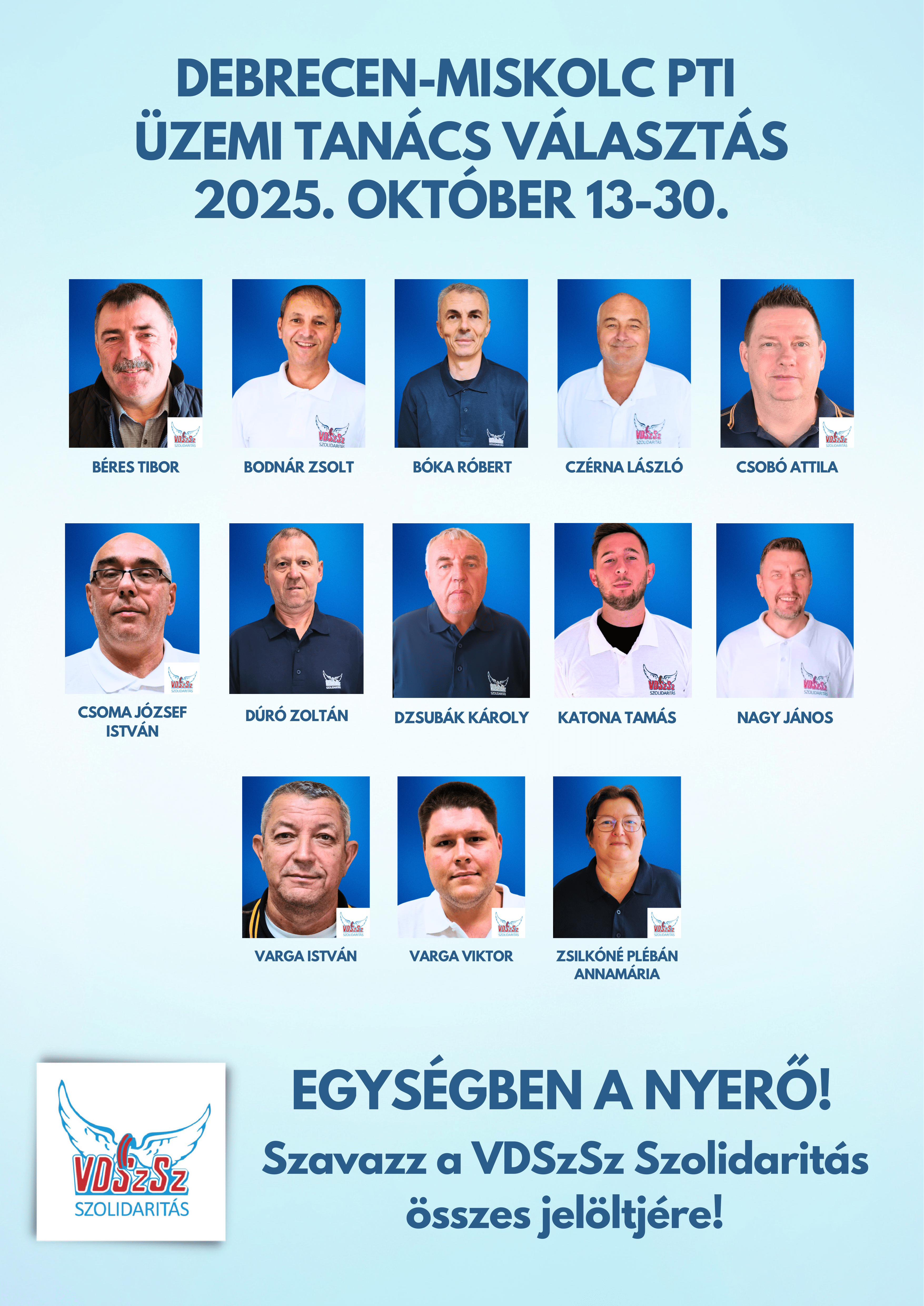 Kérjük, KIZÁRÓLAG a VDSzSz Szolidaritás jelöltjeire szavazz, közülük viszont MINDENKIRE! Támogatásodat köszönjük!